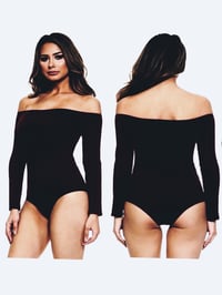 Trendsetting Bodysuit. Constructed of a nylon/ spandex fabric, this sexy top offers a smooth feel and figure-flattering appearance. The bodysuit features off-the-shoulder long sleeves and a Bikini cut bottom.